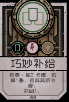巧妙补给 A级,这张牌的实际效果是消耗0回合0张牌,这张牌就相当于在牌组中不存在。所以理论上只要牌组够精简,复数的这张牌是可以无限打出的,但是由于回收属性在,当你无限打出这张牌的时候,你有回收值的概率赚一张牌。所以回收值越高,说书速度就越快,百分百的时候就是打一张赚一张。