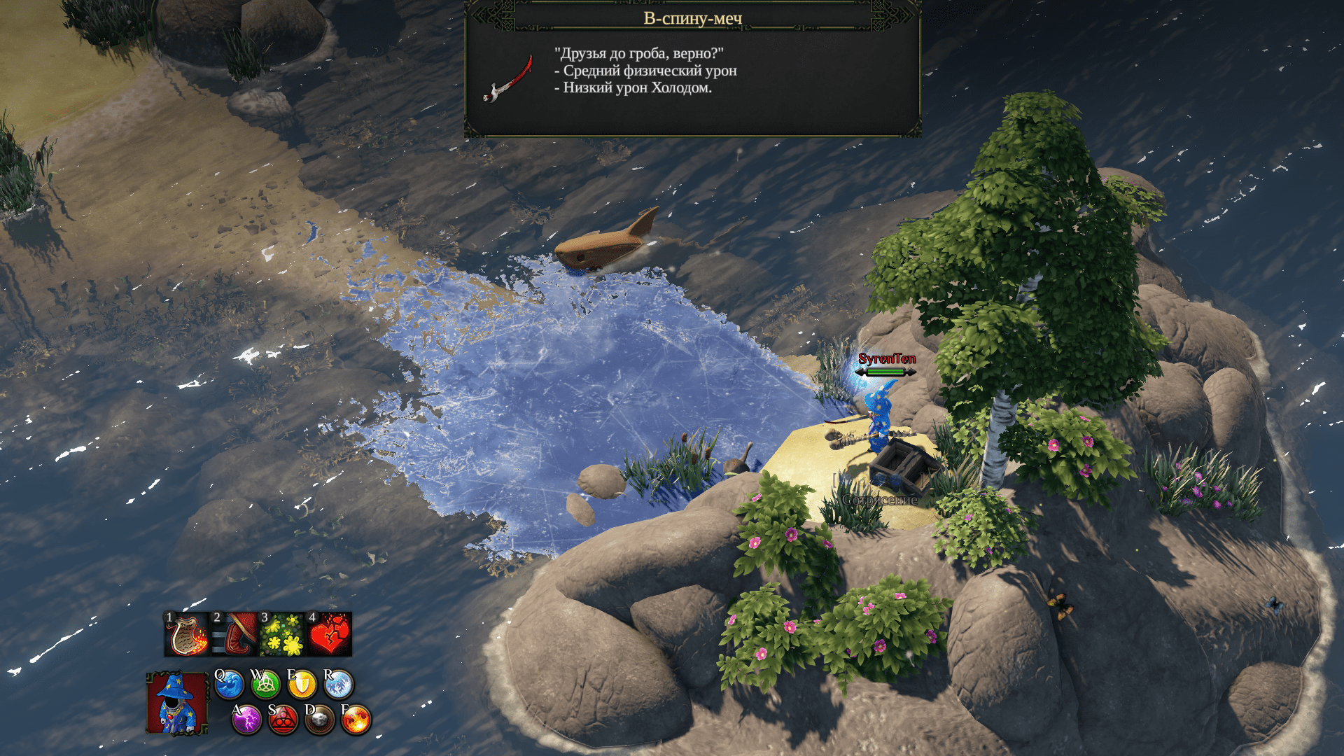 在水下找到清晰的小径后,冻结水面并前往小岛。开启宝箱。