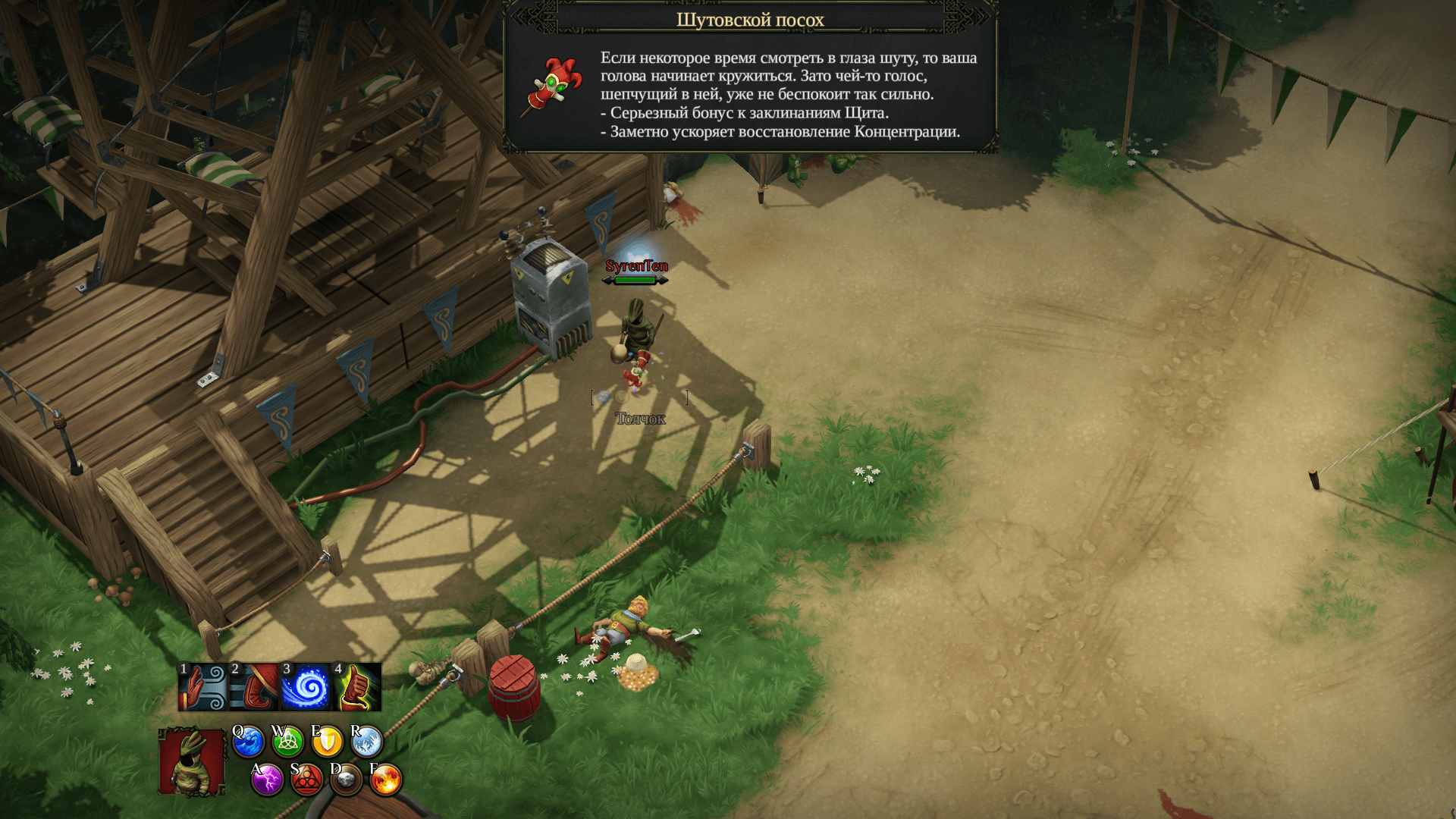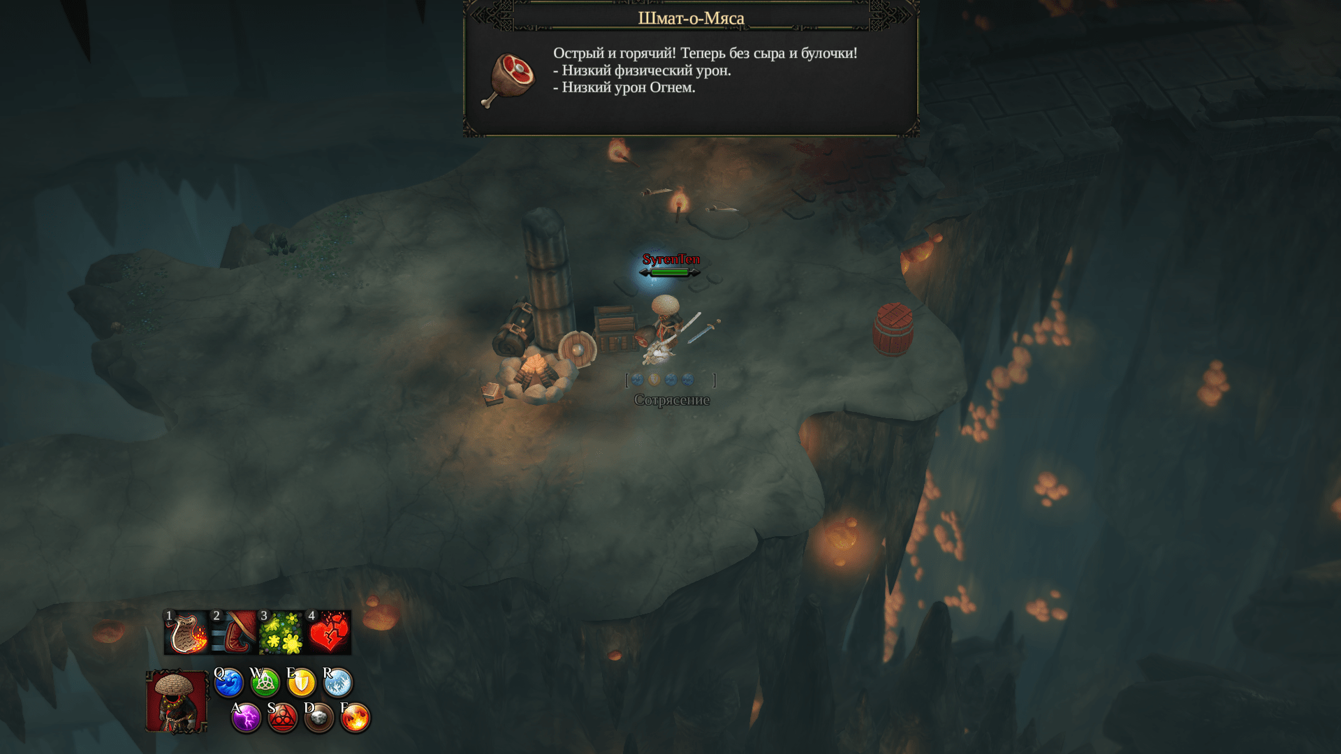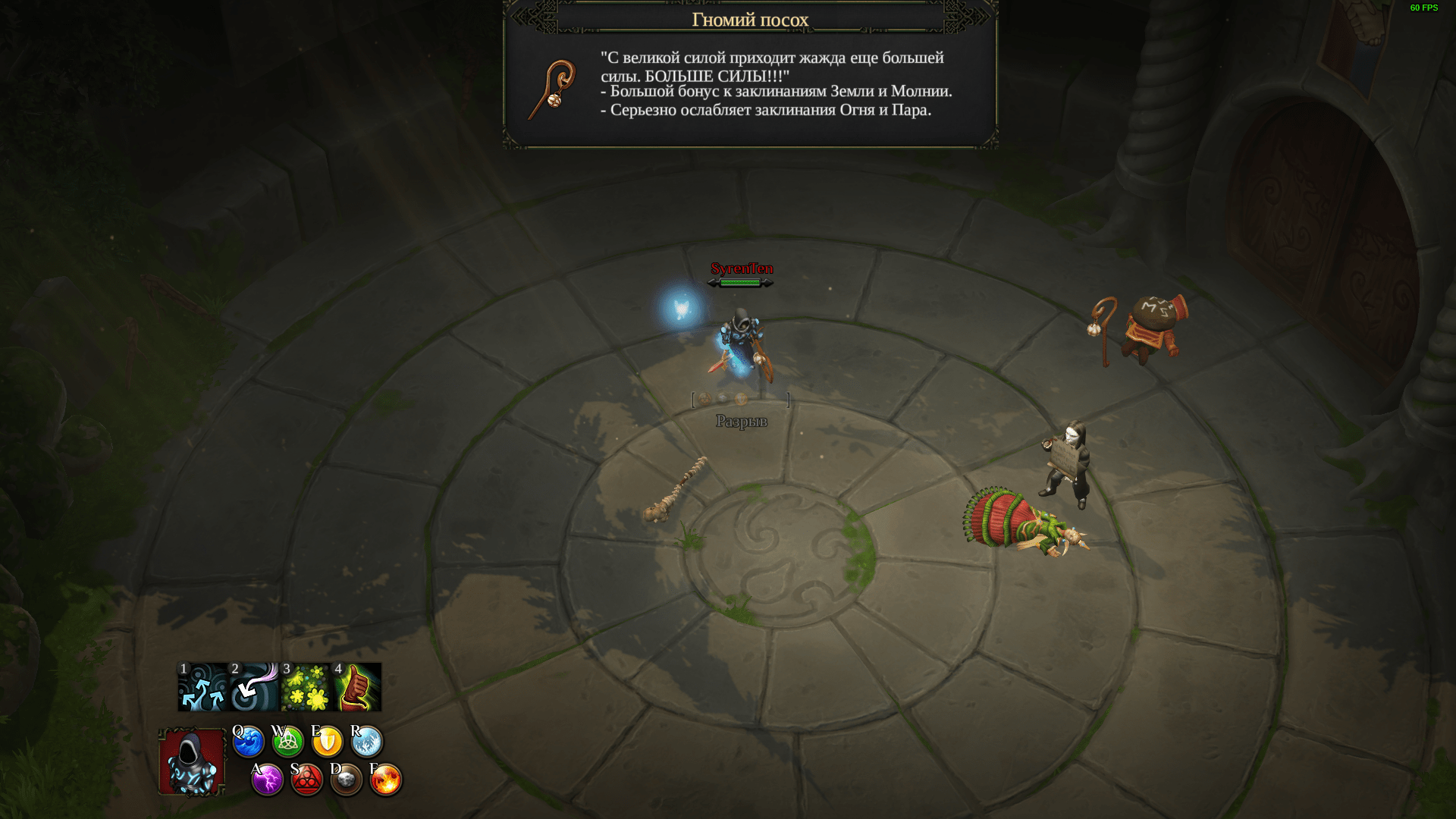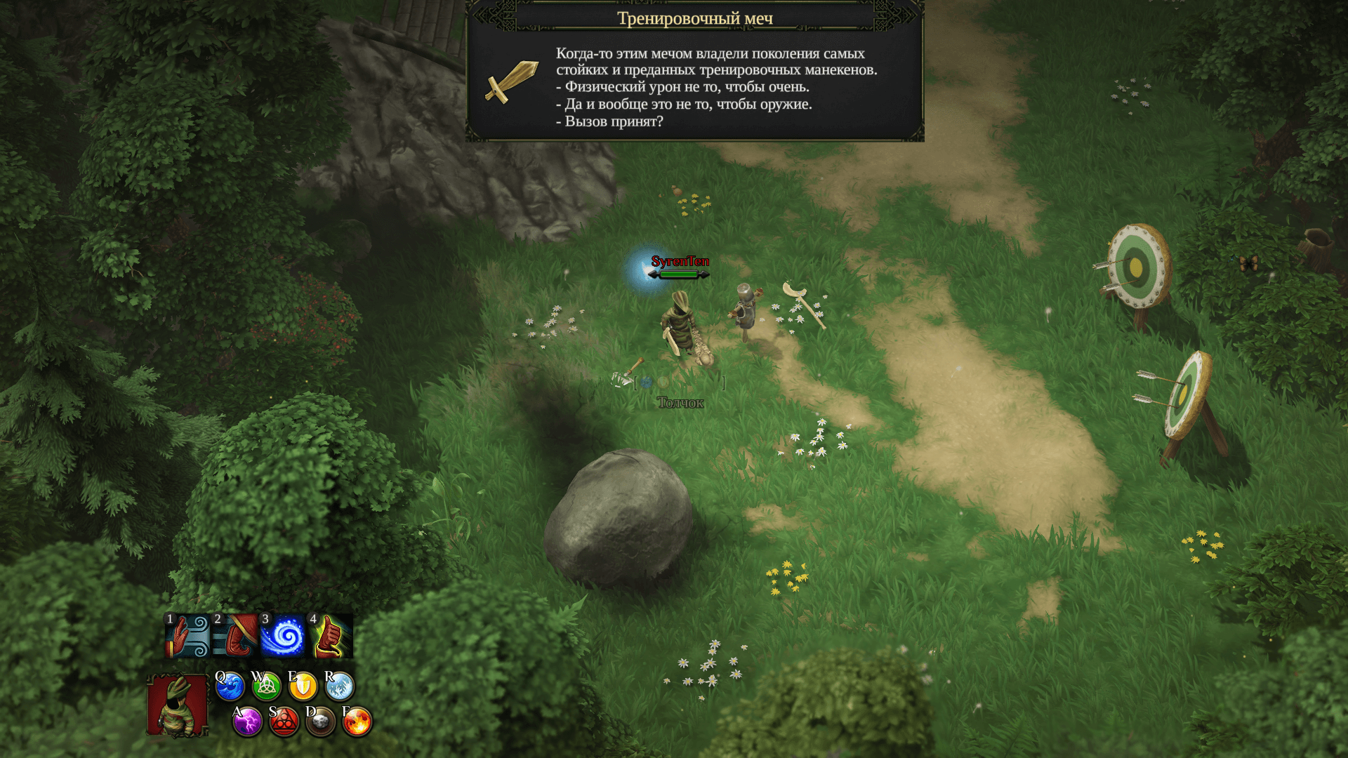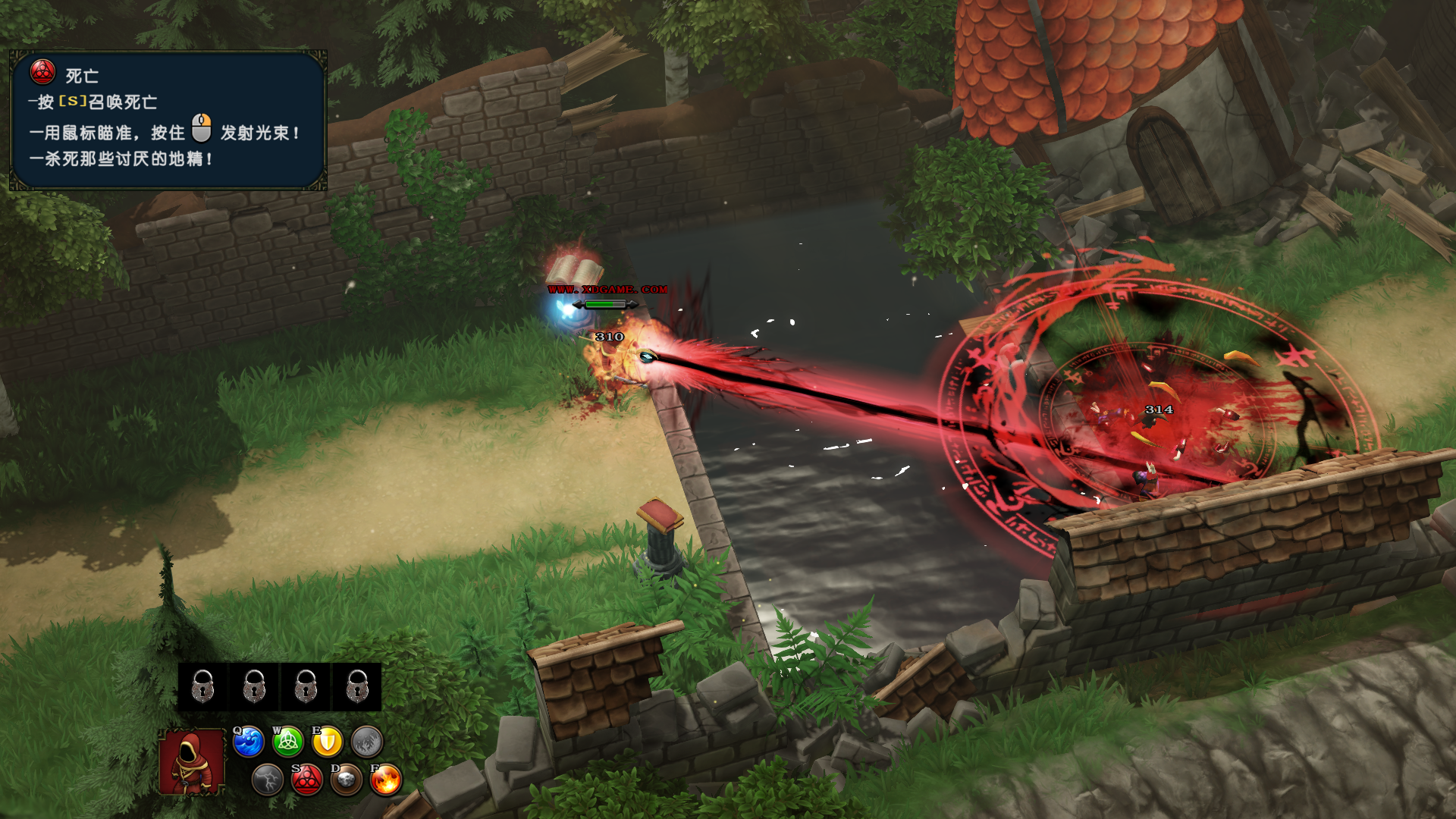 看见巨石就推下去。消灭烦人的哥布林弓箭手,然后打开大门。按指定顺序点燃篝火。