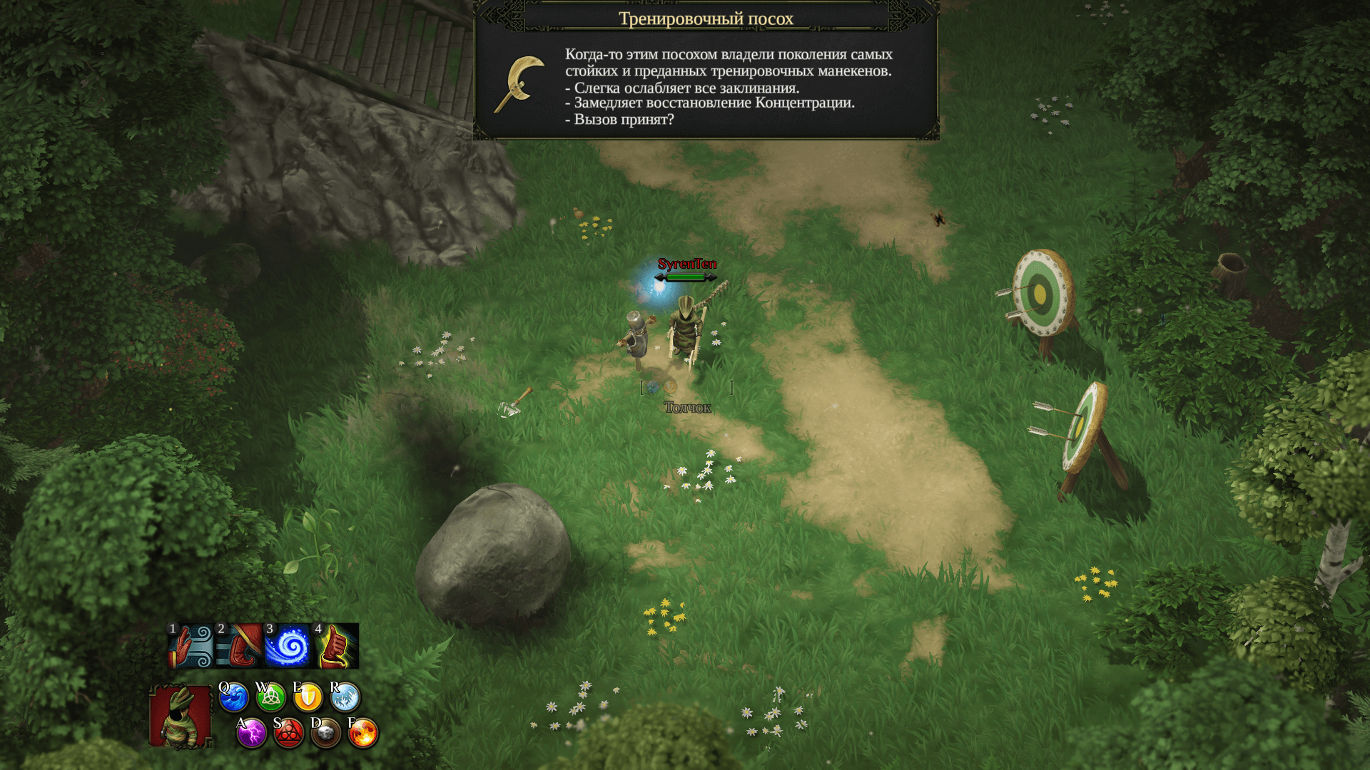 去找我们的老朋友——假人蒂米,把他撂倒,这根法杖就归你了。