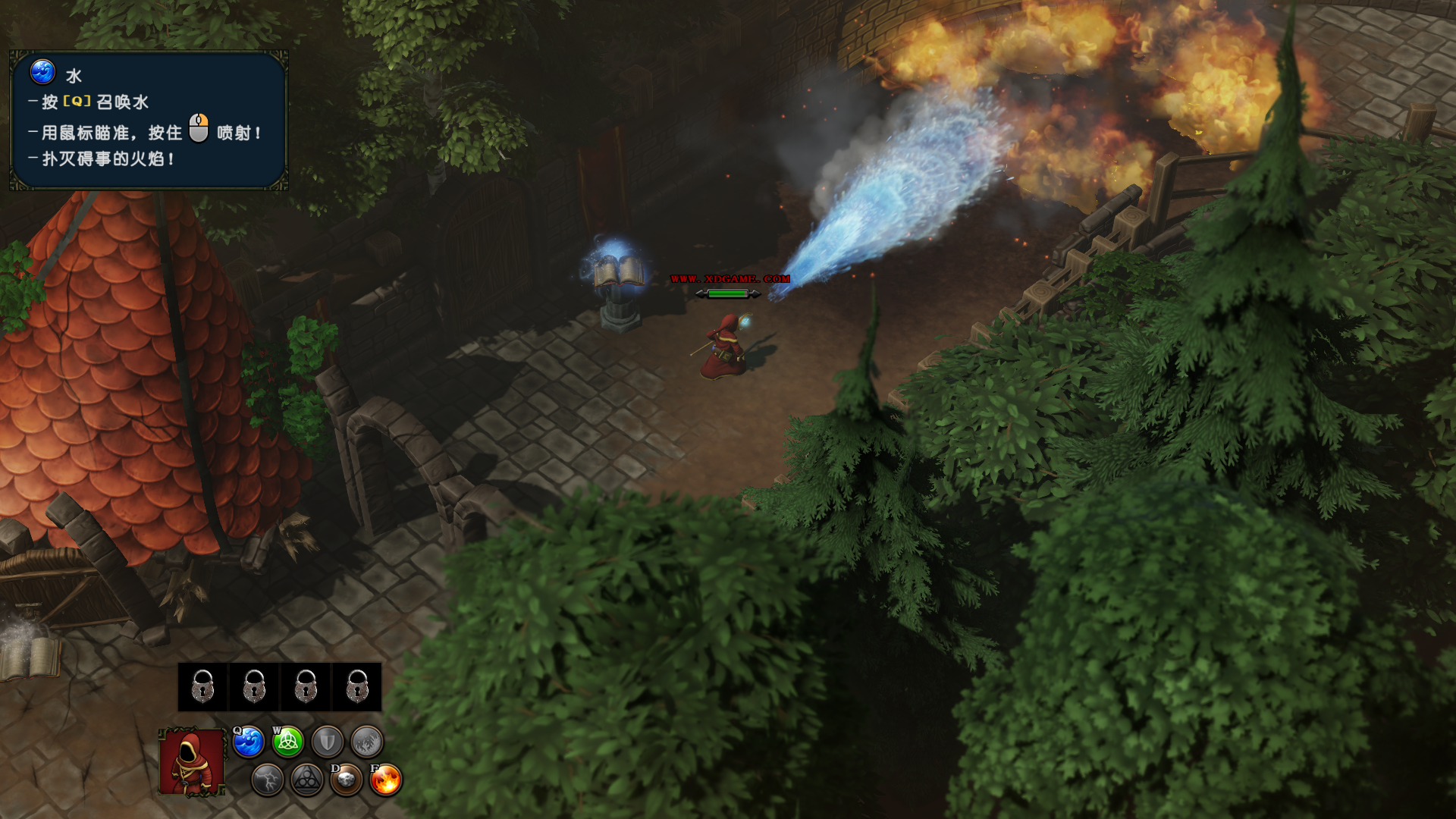 4、水魔法,点击“Q”键位,融合水元素,玩家可以按住鼠标右键喷射水柱熄灭火焰。