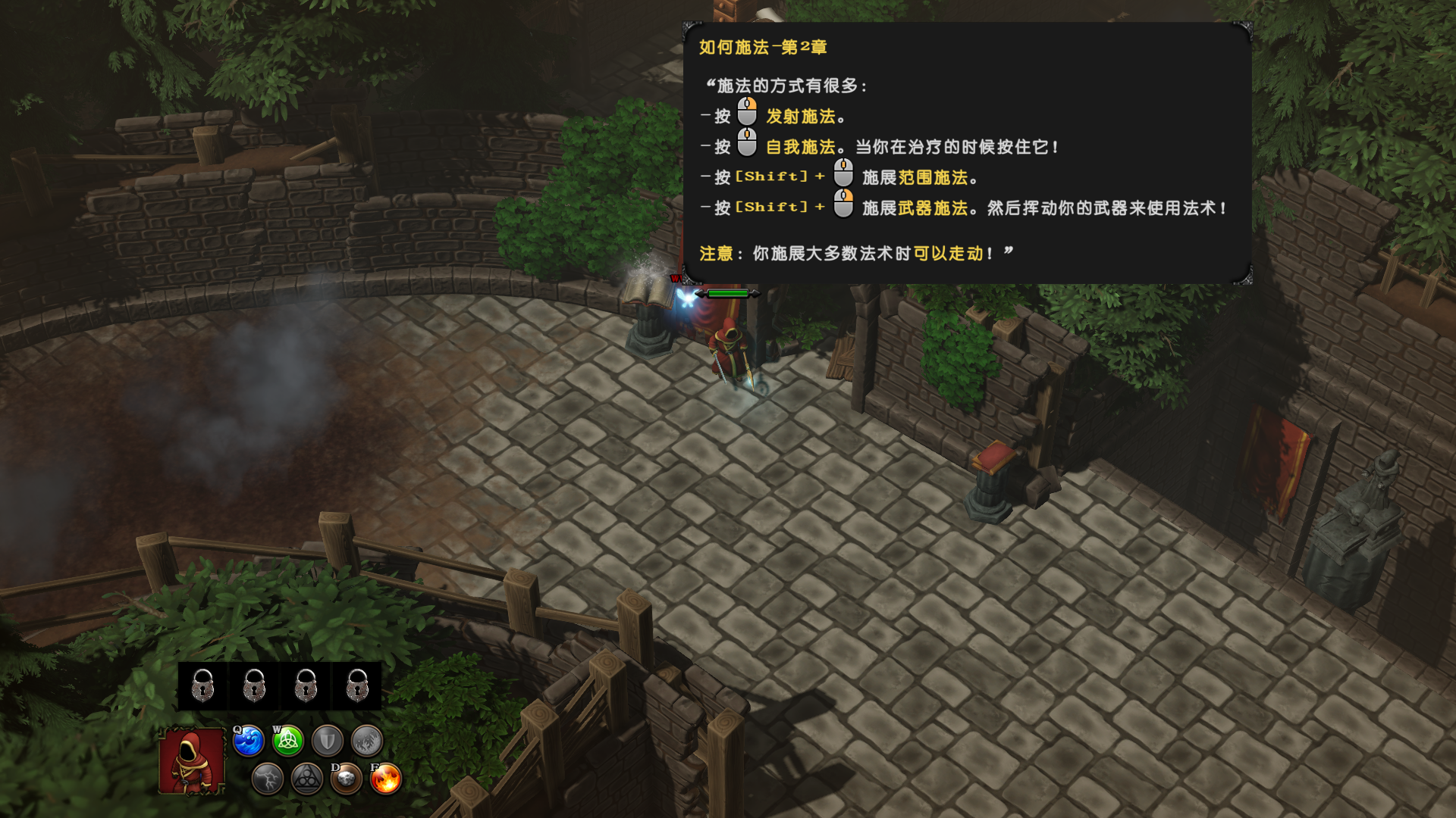 5、游戏中的施法共有四种,鼠标右键,发射魔法;“Shift”键+鼠标右键,可以给武器附魔,施展法术;“Shift”键+鼠标中键,施展以自己为中心的范围魔法;鼠标中间,可以对自己施展魔法,生命魔法可以治愈自己,护盾魔法可以添加护盾,其余魔法会损伤自身的血量,水魔法会让自身湿透,此时对敌不要使用电魔法。