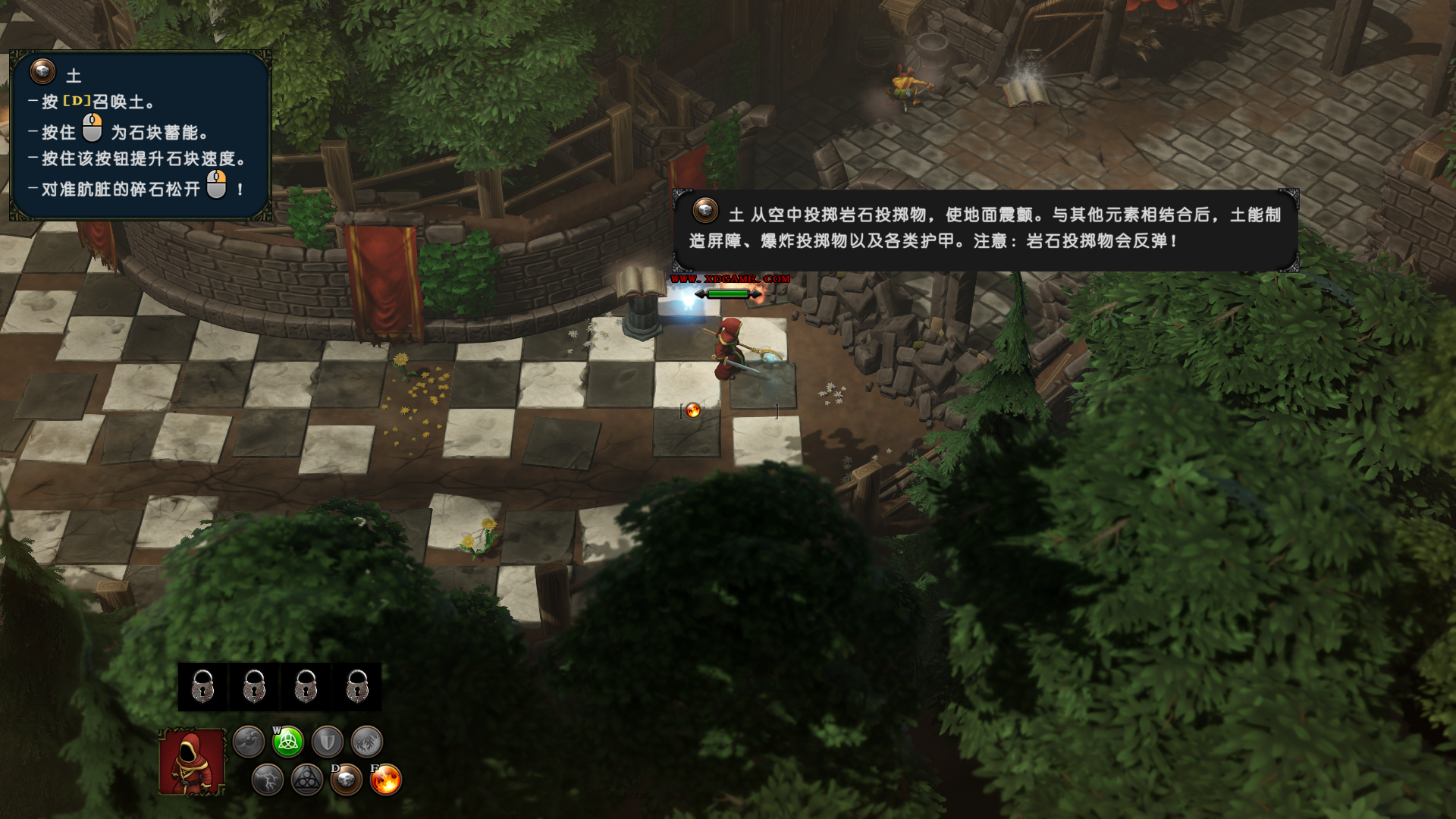 3、土魔法,玩家可以点击“D”键,融合土元素,长按鼠标右键可以控制土魔法的释放方向,可以破坏坚固的障碍。