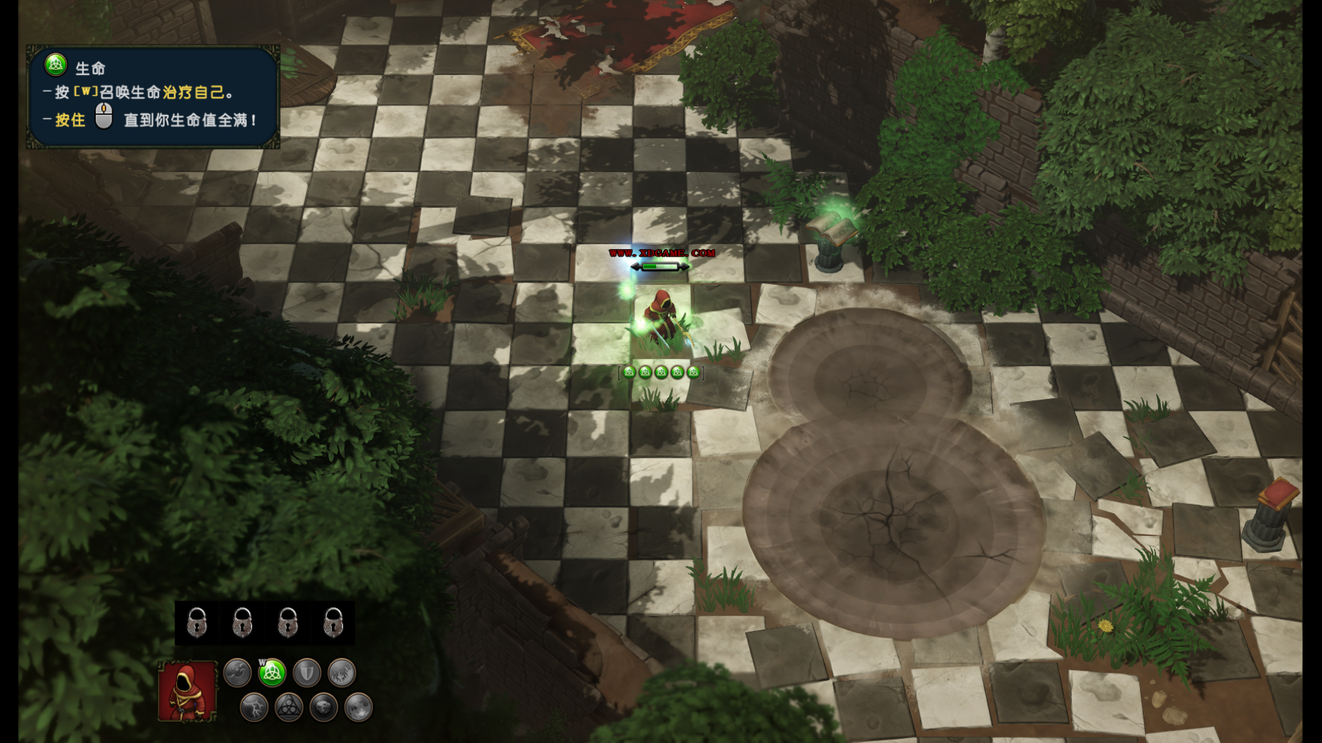 1、魔法对抗2游戏角色通过鼠标左键点击移动,也可以长按鼠标控制角色移动的方向。首先学习的是生命魔法,快捷键是W,可以按五次,也就是五次生命元素叠加融合,按住鼠标中键,可以给自身施法,增加生命值。