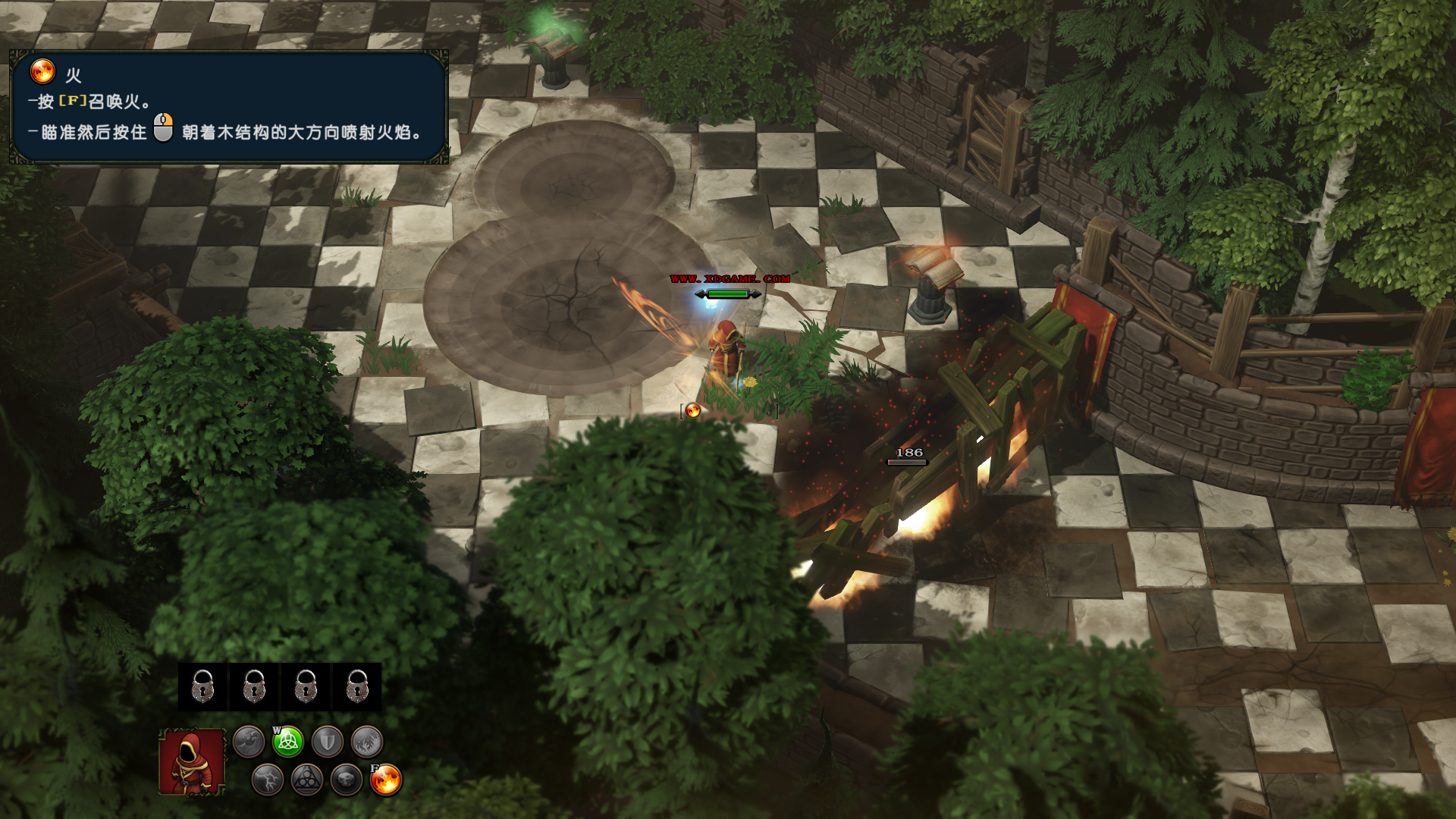 2、火魔法,玩家可以点击“P”键,融合火元素,五个火元素叠加可以伤害更为可观,可以破坏木制障碍。