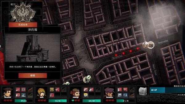 华沙游戏中文版界面很简单,左上角是任务提示,下方是队员的各项属性,而右下角则是AP点数。