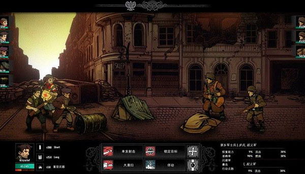 华沙中文版(WARSAW)是一款二战题材的小队模式回合制战棋策略游戏。游戏采用非常有特色的欧式漫画画面风格,并且在剧情方面采用穿插的方式让有的剧情更加的富有趣味,在游戏中玩家需要在主基地接受任务,然后选择参加此次任务的人员和装备,人物角色的职业主要有战士,高火力输出为主,辅助,分为医疗和弹药补给两种,不过主要根据技能来,有的辅助也可以有高伤害武器配备,然后是指挥官,主要技能是基于敌军群体效果。游戏中角色死亡后是没法复活的,需要玩家重新招募,能招募到的角色也是随机的。游戏的玩法非常的像《黑暗地牢》,但是在借鉴的基础上,本作还做出了创新,首先战场上的站位不再只是一行,而是由两行,这样也就大大增加了参战人数上限,除此之外,战斗场景中还加入了掩体系统,游戏的难度稍高,所系这款游戏非常的适合喜欢二战题材和硬核策略回合制玩家,如果您是,那么这款游戏还是非常值得体验一下的。喜欢的朋友赶紧下载体验吧!