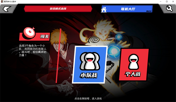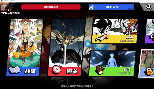 真死神VS火影绊游戏提供单人闯关挑战、人机对战、双人对战,并支持联机大厅,让玩家既能独自磨练技巧,也能与好友一较高下。此外,游戏体积小巧,但角色技能各具特色,战斗节奏快,打击感十足,适合喜欢动漫格斗的玩家。