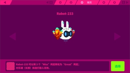 Rabot-233 可以将5个“Miss”判定转化为“Great”判定,对乐谱和长按敌人无效。