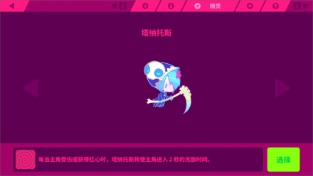每当主角受伤或获得红心时,塔纳托斯将使主角进入2秒的无敌时间。