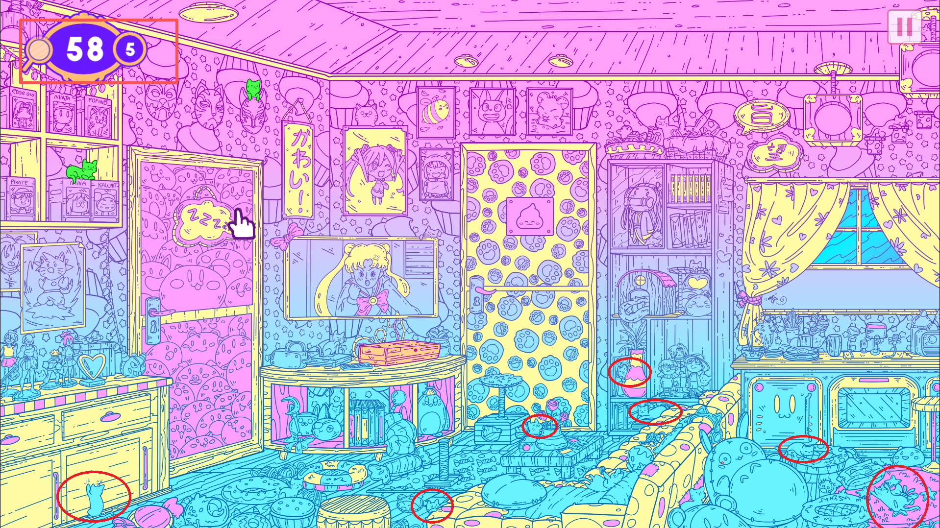 6、游戏需要玩家尽可能的找到更多调皮的小猫,点击即可,找到的小猫会变成另一种鲜明的颜色。