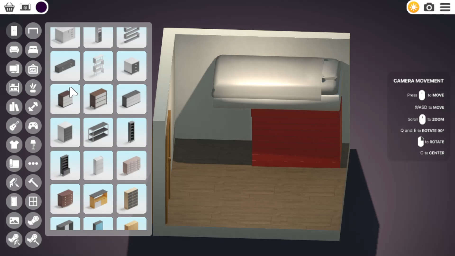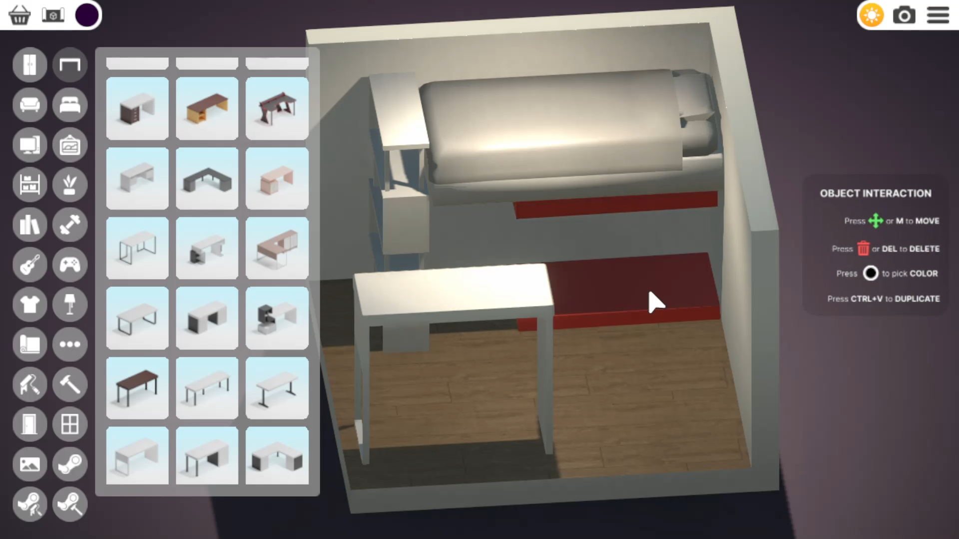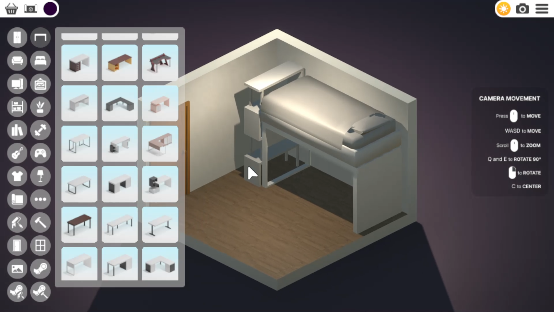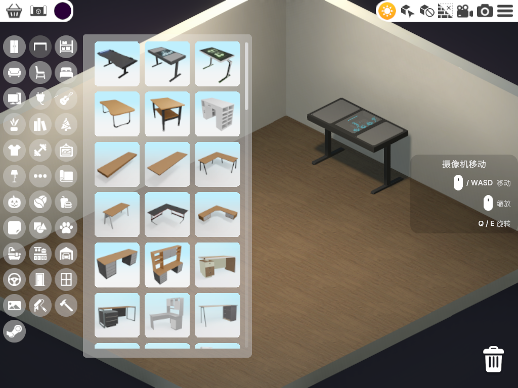 没有网格的限制,完全自由摆放。如果你对家具摆放的位置不满意可以随时移动到新位置。房间里的家具没有数量限制。创造出一个又小又整洁的办公室还是一个摆满电脑和其他物品的大工作室,都取决于你。