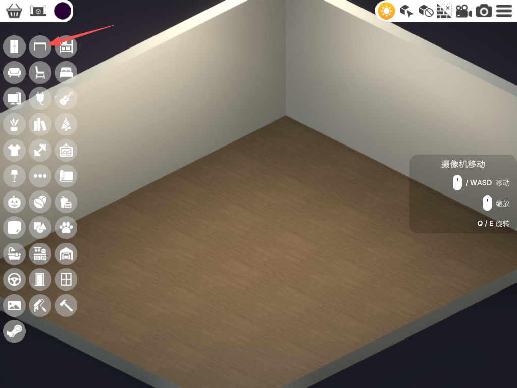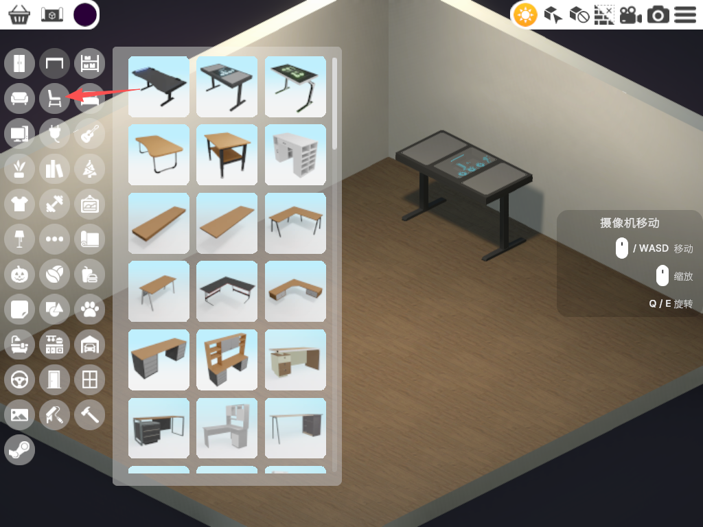 2、制作简单的电竞房为例,点击屏幕左侧的“桌子”标识。