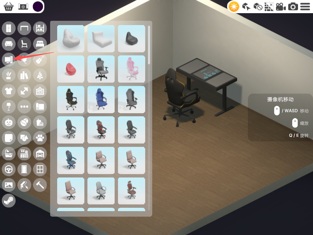 4、有了桌子,接下来自然需要椅子,依旧点击屏幕左侧的“椅子”标识。