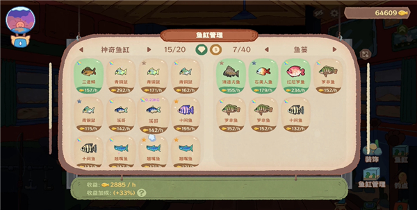 将钓到的鱼放入鱼缸,静静欣赏它们悠闲游动的身姿,同时还能获得额外收益。升级鱼缸,扩展空间,让你的鱼缸变得更加丰富!