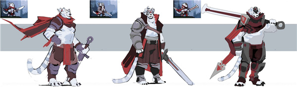 角色初期以白虎加红色披风为概念设计,考虑到游戏中的灵活性和表现力,为了更加贴切人物的性格,选择了比较精练的围巾加上铠甲的设定。
