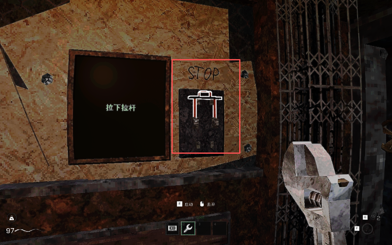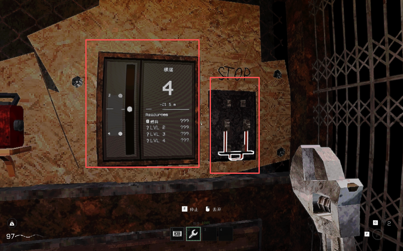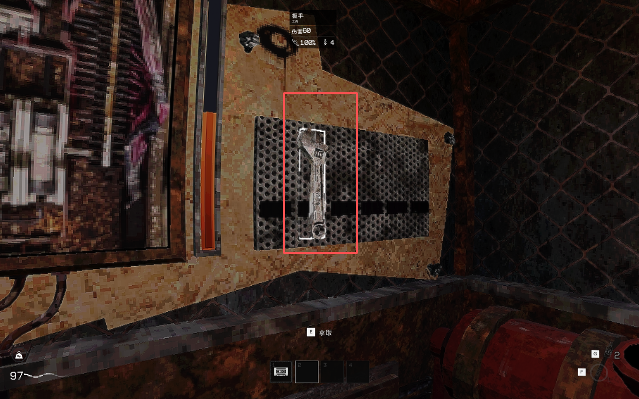 7、进入电梯,可以在左侧发现“扳手”,前期绝佳的新手武器。