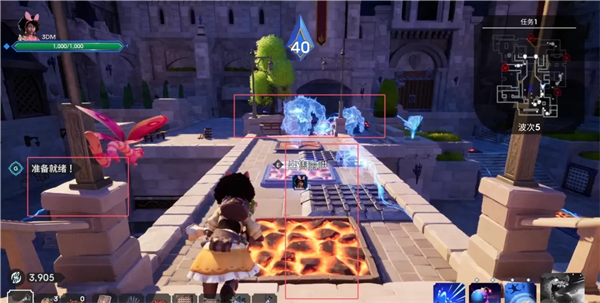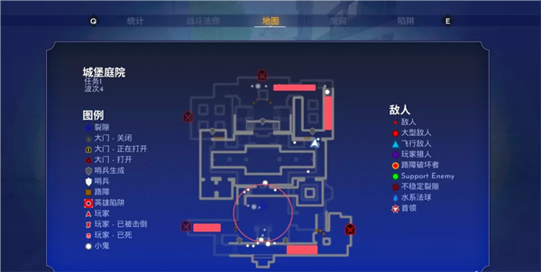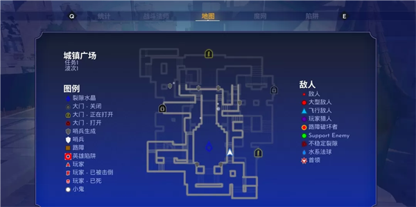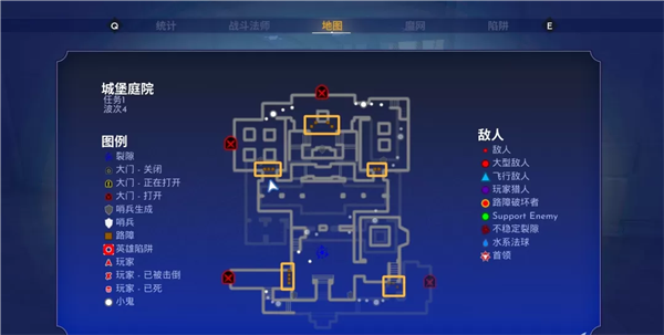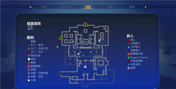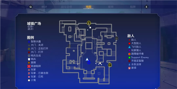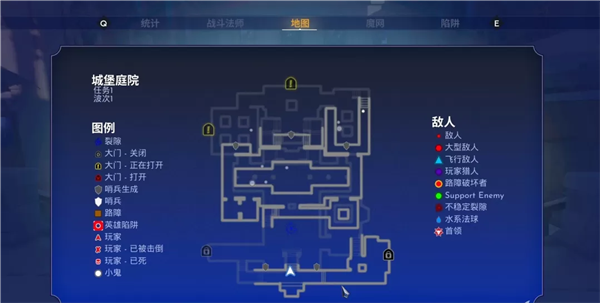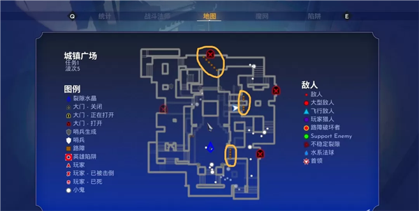 左上角两个门在这条路上就基本会掉完,但是要小心后面两波会从左边的那个门刷出飞的,绕过之前设置的路障,看到有蓝色的三角出现,就要优先去清理。