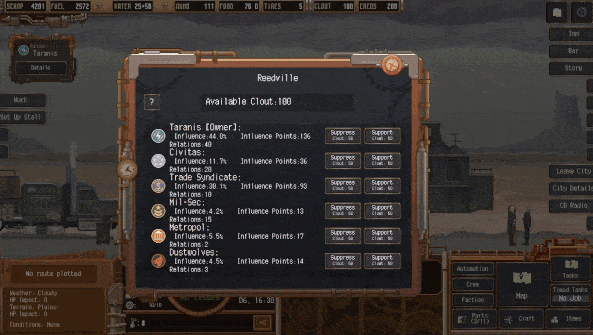 尘域配送,一般又称尘土快递,英文名为Dustland Delivery。这是一款结合生存、交易与策略元素的冒险经营类游戏。以末日世界为背景,玩家将在一个充满危机和机遇的废墟世界建立自己的贸易帝国。在尘域配送游戏中,玩家驾驶一辆可改装的货车,穿梭在僵尸横行的荒野中,需要召集不同的冒险家组成小队,以此确立贸易路线、控制资源的流向,努力将自己的城市建设成为尘土之地的首都。危险潜伏在每个角落——但没有风险,就没有回报,快来尘域配送游戏中体验一下吧