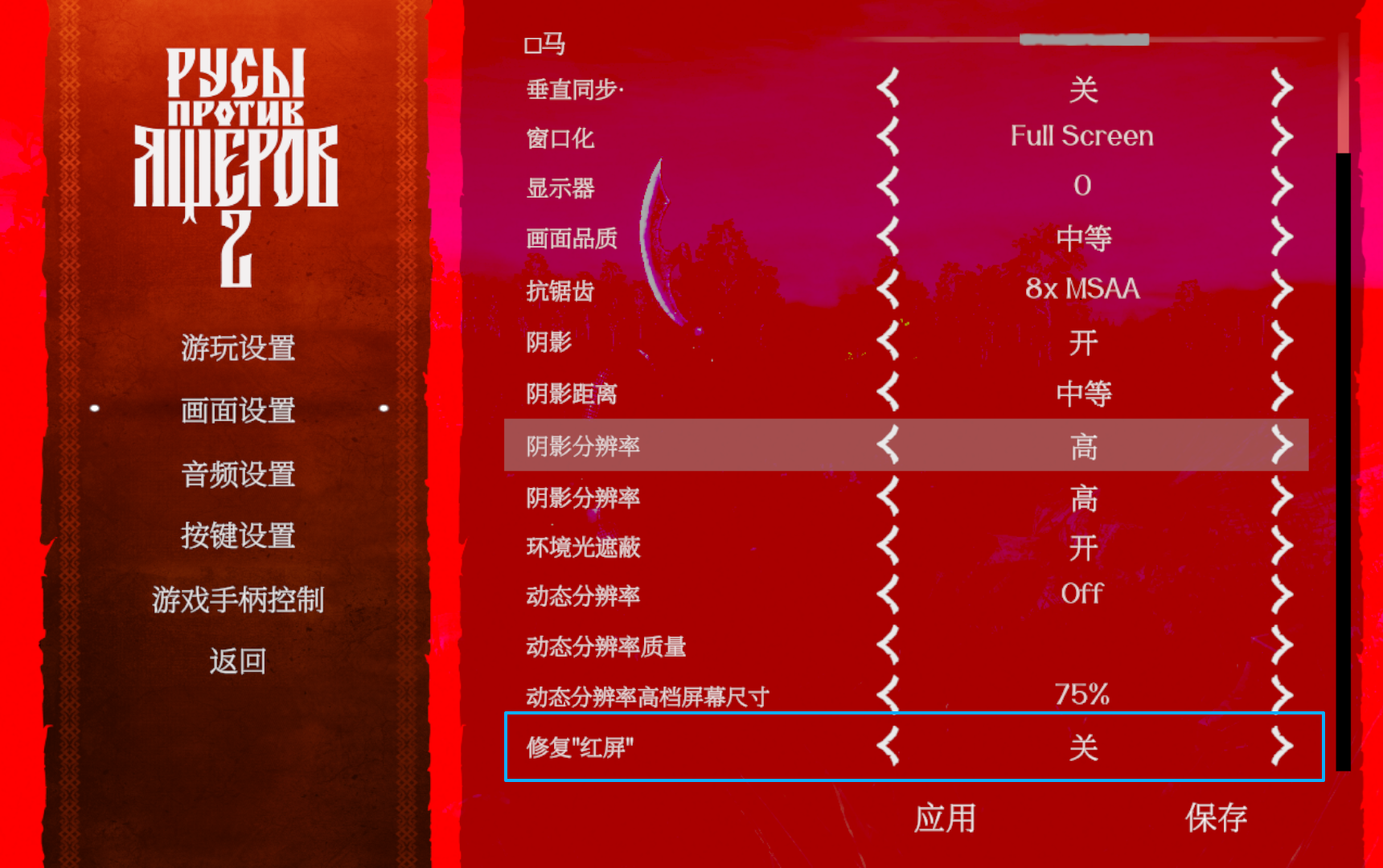 3、将屏幕右侧的设置界面划至最底部,找到“修复红屏”,将其开启,随后点击屏幕下方的“应用”和“保存”。