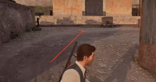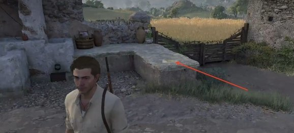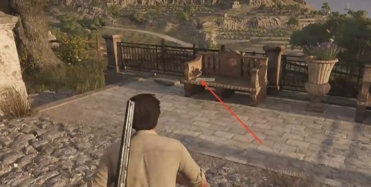 2、进入地图,报纸就在这个木质架子车后边的石凳上。