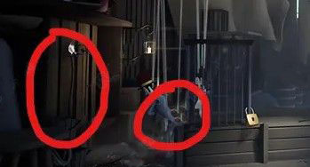 被关进笼子之后,可以用苹果砸下左侧墙上悬挂着的工具来吸引团长,等团长去捡就可以从其腰上偷到笼子钥匙,打开锁就可以跑出笼子;