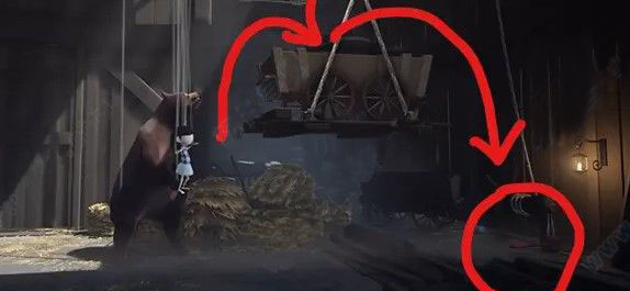 4、来到木桥边,转动转盘放下木桥,来到对岸,之后通过小车前面的一个钩子来拖动它,这个谜题的要点是:把木车拉过吊桥,之后等吊桥升上去后把木车推到悬崖下去,需要反复拉车多次,从而在吊桥收回之前把小车拖上吊桥。