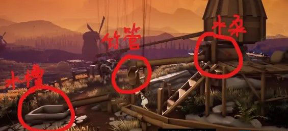 1、风车前,先压边上的水泵一会让水持续流出管子,之后稍稍靠近上方竹管,用提线让其改变方向,使水流向左流入石头水槽,随后牛去喝水,风车转动,就可以离开了;