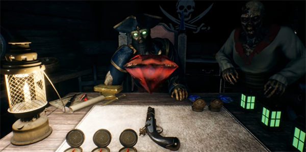 《亡灵宝藏》是一款以加勒比海为背景的冒险游戏。游戏中玩家会在波涛汹涌的海域遇到幽灵船,与一群眼神凶狠的幽灵海盗展开生死对决。每轮对战中,你和海盗会轮流用一把只含一颗魔法子弹的滑膛枪朝自己开枪,击中海盗则获胜,没击中就会被反制,灵魂力量被削减,最终可能被困在船上成为幽灵的一员。