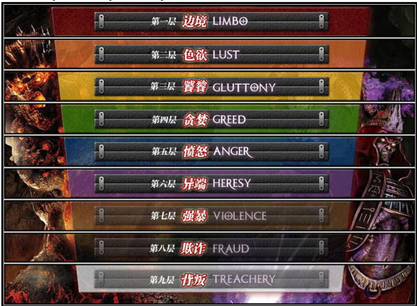 包括凌波幽冥(limbo)、纵欲(lust)、暴食(gluttony)、贪婪(greed)、愤怒(anger)、异端(heresy)、施暴(violence)、罪恶之囊(fraud)以及背叛(treachery);每一层地狱将有独特环境、崭新生物、骇人恶魔、故事元素以及精彩配乐,来描绘该层受难死者所犯下的罪刑。 在游戏初期但丁的武器是“死神镰刀”,它拥有多种用途,并可以造成严重的伤害。“十字架”则是碧儿翠丝(Beatrice)给但丁的,上头附有圣神力量,可以搭配镰刀使用。但丁在游戏中会获得魔法能力,而且一切都可以升级,由玩家在冒险过程中决定要升级哪些能力。