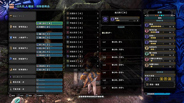 自带两个2级孔,孔位非常富裕,可以出耳塞5和体力增强3,对于锤子开荒是很友好的。这套还自带2级投射器装填up,在开荒期间可以更方便的让怪物撞墙,这个技能对于钩爪软化不掉投掷物的重武器来说是有一定意义的。