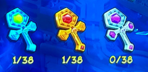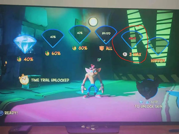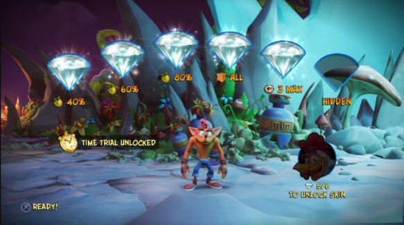 而每一关还会配置“一命通关”的徽章(N. Sanely Perfect Relic),需要玩家在普通关卡或镜像关中,收集全箱子并一命过关。在后期关卡十分变态的设计下,想“全关卡一命通关”对玩家的操作水平有着极为严苛的考验。达成这个目标要花费很长的时间练习。而普通一周目流程中的四个关卡还配备“异色宝石”(Colored gem),是一个系列保留的特殊的收集要素,收集方法异于普通钻石,需要玩家在关卡中通过解谜等方法获得。