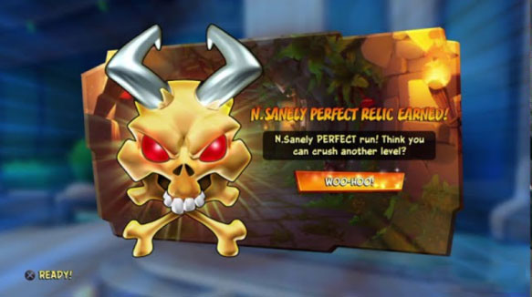 这就结束了么?还没有!最后的最后,游戏高手们的究极挑战,是几乎每一个关卡设立的计时挑战模式。通关一遍关卡后即可开启。在通关过程中一命不死的前提下,摧毁沿途的宝箱,尽快地抵达终点。游戏会根据你的速度颁发徽章(Time Trial Relics),一共有蓝宝石、黄金、和白金三种等级。而如果你跑的足够快,跑过游戏开发者的成绩,游戏还会给你颁发紫色的“开发者徽章”。这就需要你非常熟练的掌握游戏操作系统了,熟练到比开发者还要了解的程度。不过幸运的是,游戏内的收集要素(奖杯、成就)仅涉及白金级别的徽章。