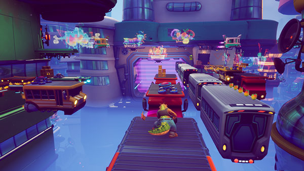 比如,2084年的 The Hazardous Wastes 是一片“后启示录风格”的未来荒漠;公元前8800万年的 Eggipus Dimension 带你回到恐龙追着你跑的远古世界;1402年的 Tranquility Falls 是一个充满着中式建筑的世界,其中会看到东方美学下的龙在空中飞舞;而3023年的 The Sn@xx Dimension 又是汽车在空中满天飞的未来都市……在这里就不一一列举了,而我重点想说的是,每一个世界都拥有着极高的美术质量。与之前《疯狂三部曲》(其实《疯狂三部曲》已经做得足够好了)相比有着质的飞越。《古惑狼4:时机已到》营造了一种区别于《疯狂三部曲》的全新质感,而每一个场景都有着极为丰富的细节,并且在这些的基础上保证了60帧流畅运行。如果说 PS4 的1080P 60帧的版本看起来还会有一种“有一层雾,整体颜色发灰”的感觉,那么升级版 PS5 的 4K 60帧则打破了这一层“雾”,画面色彩清晰明亮,再加上60帧的丝滑体验,给人总体的感受一个词概括就是:舒服,真的舒服。