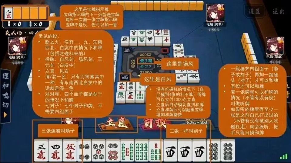 作为新手,了解基本规则很重要。麻将牌分为万、筒、条、风牌和三元牌等类型, gameplay 还包括胡牌、宝牌、副露等机制。想要胡牌必须有役种,比如场风牌、门风牌或断幺九等。避免无役的关键是确保自己的牌型有役。