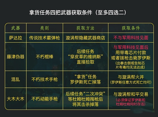 说回游戏本身,这里拿武器的逻辑线非常复杂,为方便大家记忆,我做成了表格,如下图示: