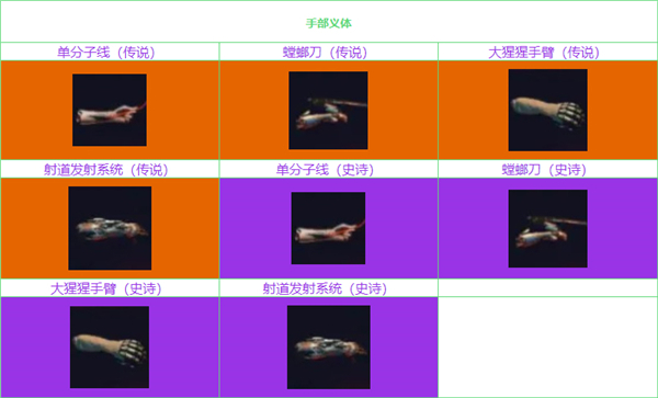 义体基本上没有理解难度,都是字面意思。这里重点说一下战斗义体,也就是手臂义体,共有4类:大猩猩手臂属于钝器类,螳螂刀和单分子线属于刀剑类,射弹发射器属于智能武器类。