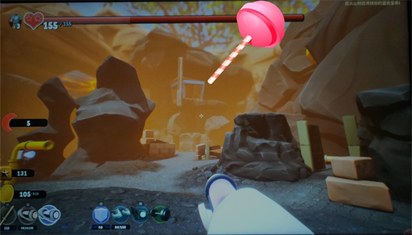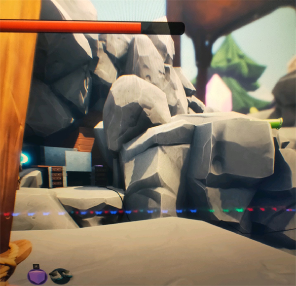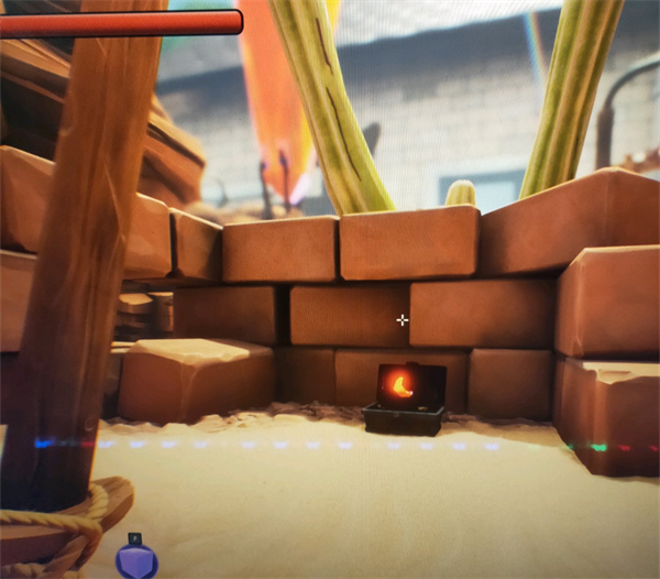 5、第五个红月位置在钻三明星家出门向左看,即下图,深沟对面有几个金币那里(棒棒糖指着),就有红月箱子。问题是想要过去的话,理论上用身后发射黄球给自己加速才能飞过去