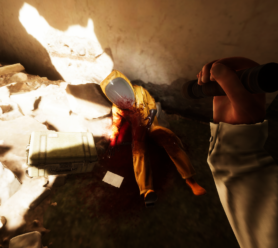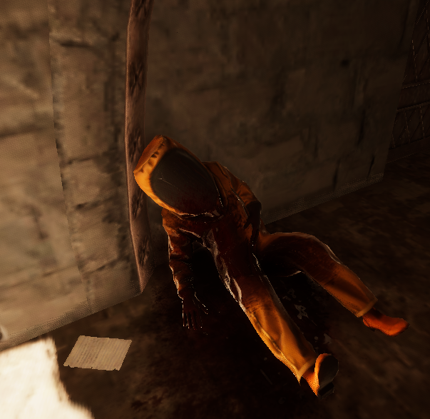 穿过狭窄的通道后,我们将进入一个狭长的房间。里面有个装着战利品的黄色箱子,还有我们需要的带着箱子的尸体.