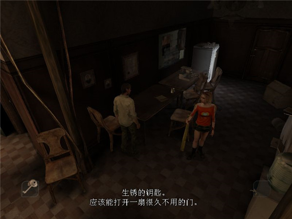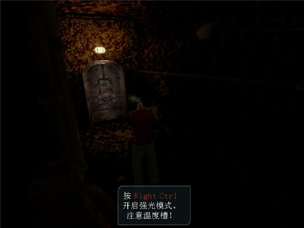 杂物室里有微弱的光线,突然,一阵脚步声从脚下的地底传了过来。“谁在哪儿?”但脚步声随后也消失了。小伙子在地下室的房间木桶上发现了一卷胶带和一把手电筒,他捡起这些东西,打开手电查看四周的情况。他的第一个重大发现竟然是桌子上木匣里的一把手枪,他拿起手枪,这时底层又传出了一阵令人毛骨悚然的嚎叫声。“谁在那儿?”Kenny不由得又叫嚷了一次,但依旧没人答应。Kenny把手电用刚才拾到的胶带绑在手枪枪管上,然后顺着梯子爬下去。地下室底层的通道里破败不堪,充满着刺鼻的怪味,Kenny不由得捂住鼻子,眼看视线受阻,他赶紧打开手电的强光(按住右Ctrl键),几欲令人窒息的雾气居然马上消散而尽,真是神奇哦!