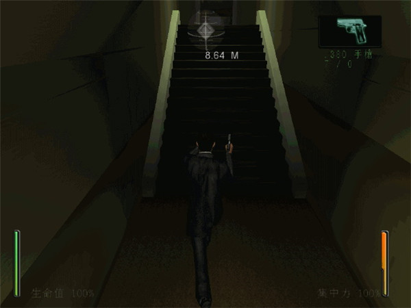 在升降机外的,是大量持有手枪的守卫,如果直接冲出去的话是必定会受伤的。由于在附近的位置并没有什么特别可以用作遮掩的东西,建议大家还是一口气冲到尽头会较有利。但如果不想那么泻气的话,或者可以尝试使用集中力,尽可能把敌人分批和击倒是没有办法之中的最佳办法,记着每逢把一批敌人击倒之后,先站在安全的位置回复体力,接着才继续向前直,否则的话将会和送死没有分别。