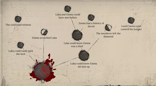 与卢卡和克雷文勋爵交谈,听取他们的辩护。当你用完与他们的所有对话后,打开心灵宫殿菜单并连接所有证据。真正的杀手是媒介卢卡。他从他作为小偷的经历中知道如何开锁。他闯入艾玛的房间并杀死了她。他也认识她,她也是小偷,他们曾经相识过。然而,艾玛实际上是钻石的小偷,并设置了卢卡,试图让它看起来像是他偷的。这激怒了卢卡,他谋杀了她。