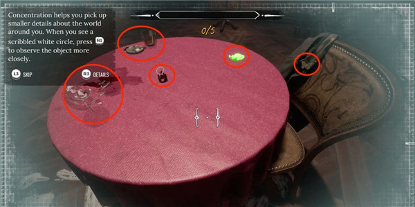 首先,您需要检查房间中间桌子上的 5 件证据。它们在下面用红色圈出。棘手的是挂在椅子上夹克上的蝴蝶胸针。它需要将光标精确地放在上面。正确放置时,光标会变为黄色。