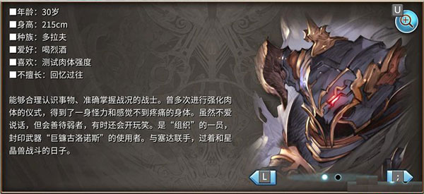 隶属于旨在狩猎星晶兽的“组织”的多拉夫族战士,也是封印武器“巨镰古洛诺斯”的契约者。