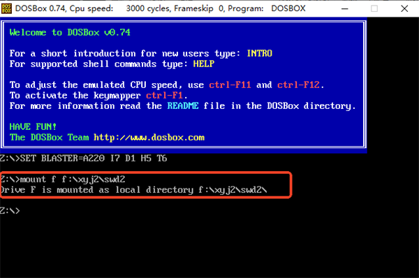 3、首先输入mount f f:\xyj2\swd2(f为软件目录盘,放在c盘同理),然后敲回车。