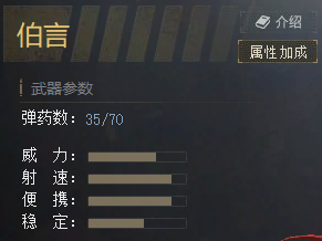 伯言前置弹夹35,备弹75。威力,爆头一枪,胸部两枪。射速40发/5秒,换弹2秒。