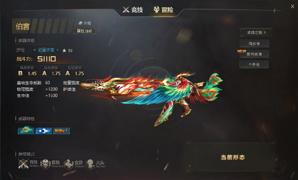 伯言是一把3配件英雄级步枪,伯言的配色比较绚丽,整体上是一只展翅的孔雀造型。伯言外观上的亮点是进入游戏后,按V键观赏,伯言会脱离玩家手持,展翅飞翔。造型偏玄幻向。
