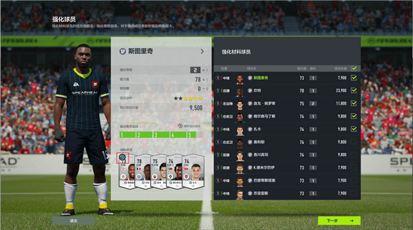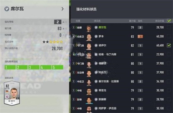 左侧为当前选择球员的基础信息,点击上方名字可改变强化球员,右侧为强化材料球员,每次强化可选择1-5名球员作为强化材料,强化材料与被强化球员无需为同一名球员,若强化材料与被强化球员为一致时,有概率触发特殊强化并且在强化失败时有概率恢复球员强化等级。选择的材料越多强化概率加成越高。