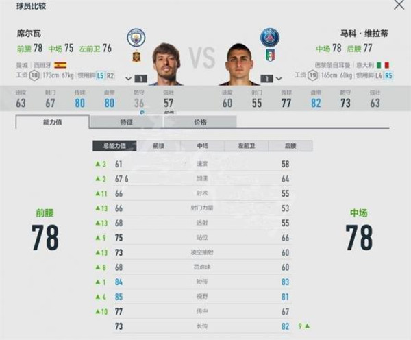 在第一名球员的信息区域进行单击,选中该球员(底色改变),将鼠标移到要进行对比的第二名球员信息区域,出现对比按,点击该按钮可进行两名球员的数值对比。