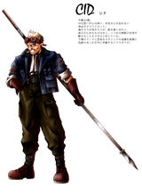 每作中必登场的希德在本作中仍与飞空艇有关,曾经是神罗宇宙开发计划的御用飞行员,极富有传奇色彩的人物,是众多飞行员们的偶像。自从宇宙开发计划废弃以来就终日在火箭村无所事事,盼望有一天神罗能重开计划以帮助自己实现飞向宇宙的梦想。 希德的个性极强,为了梦想与上司帕尔马反目后他干脆背叛神罗加入了克劳德的队伍,后来成为飞空艇的艇长,是队伍中不可或缺的角色。